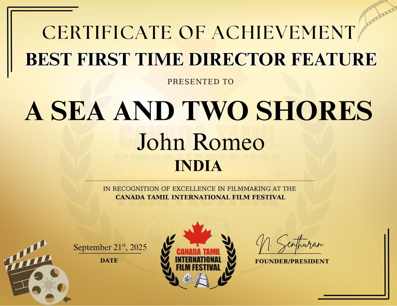 படம் முழுவதும் முடிவடைந்து பல்வேறு சர்வதேச திரைப்பட விழாக்களில் பங்கேற்று பாராட்டு பெற்று வரும் நிலையில், கனடா தமிழ் சர்வதேச திரைப்பட விழாவில் சிறந்த அறிமுகப் பட இயக்குநருக்கான விருதை ‘ஒரு கடல் இரு கரை’ (A Sea and Two Shores)