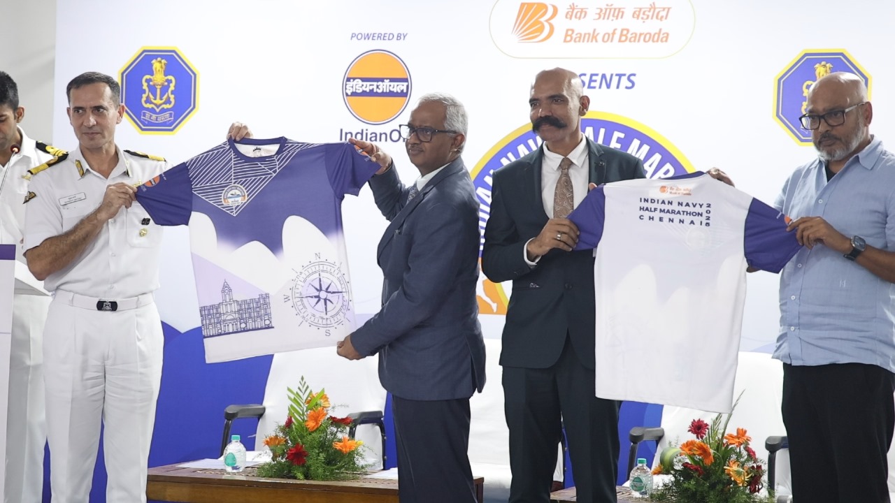 Chennai, 4 November 2025: The Indian Navy today unveiled the official Race Day T-Shirt for the upcoming maiden edition of Indian Navy Half Marathon, Chennai presented by Bank of Baroda and powered by Indian Oil Corporation Ltd. scheduled to be held in Chennai on 14 December 2025. The unveiling ceremony was graced by Commodore Suvarat Magon, Naval Officer In-Charge (Tamil Nadu & Puducherry Naval Area), Indian Navy, Mr. T. N. Suresh, General Manager & Zonal Head, Bank of Baroda – Chennai Zone, Dr. Iyappan Ponnuswamy, Medical Director & Chief Radiologist, Kauvery Hospital and Mr. Nagraj Adiga, Race Management Partner, Indian Navy Half Marathon Chennai – 2025.